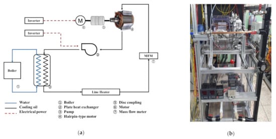 Figure 2 shows the experimental equipment used to analyze the effects of the rotation of the rotor on the flow of the injected oil and immersion oil to cool the motor. Figure 2a,b are a schematic and photograph of the experimental equipment, respectively. The rotor of the motor is rotated using an industrial motor (TEFC 2HP, Hyosung ENG, Republic of Korea). The rotor of the target motor and the shaft of the industrial motor are connected using a disk coupling (SRA-80C Disk Coupling, Sungwoo Transmission, Republic of Korea). The rotational speed of the motor is controlled by an inverter (SV015iG5A-2, LS ELECTRIC CO., Republic of Korea) and is measured using an rpm meter (EE-2N, KONEX, Japan). The cooling oil is circulated using an oil pump (TOP-210 HBE, DH PUMP Engineering Co., Republic of Korea). The flow rate of the supplied oil is measured by a flow meter (KTR-550-MF-T-Ex, KOREA FLOW METER IND. CO., Republic of Korea), and the oil pump is controlled by an inverter (SV022iG5A-2, LS ELECTRIC CO., Republic of Korea) to control the flow rate. The temperature of the oil is controlled by supplying heat from a boiler (Kiturami Electric Boiler, Kiturami, Republic of Korea) through a heat exchanger. The fine temperature is controlled by heating tape. The oil that moves to the top of the motor is sprayed through the pipe to the stator and the end-winding of the coil.