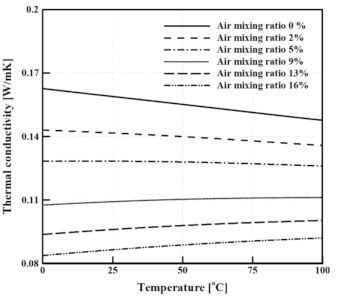 where kmixture is the thermal conductivity of the mixture, x is the oil ratio, y is the air ratio, koil is the thermal conductivity of oil, and kair is the thermal conductivity of air.