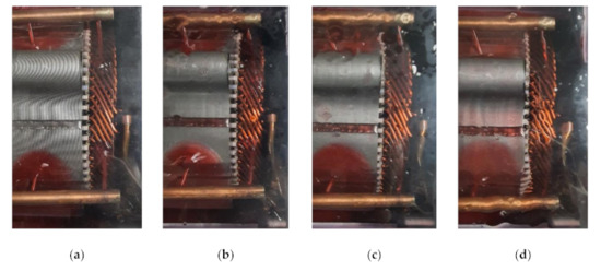 Figure 6 shows pictures of the upper part of the coil at different oil temperatures at a flow rate of 0.084 kg/s and a rotational speed of 600 rpm. Figure 6a shows the experimental results when the oil temperature was 20 °C, which resulted in little oil splashing. However, the viscosity of the oil was very high at 0.0547 kg/m∙s, which caused the formation of a thick oil film on the outer surface of the coil; however, there was not a wide formation of this film. Figure 6b shows the results at the oil temperature of 40 °C. Compared with 20 °C, the viscosity of the oil was lowered to 0.0222 kg/m∙s, thereby inducing the formation of a wider oil film on the outer surface of the coil. However, the viscosity of the oil was still high, so there was little oil splashing, and the oil film was thick. Figure 6c shows the results at the oil temperature of 60 °C. The viscosity of the oil at 60 °C was 0.0113 kg/m s, which is approximately five times lower than that at 20 °C. The oil splashing increased, and the oil film was thinner but more evenly spread compared with that at 40 °C. Figure 6d shows the results at the oil temperature of 80 °C. The viscosity of the oil decreased to 0.0067 kg/m∙s, and the amount of oil splashed increased. The amount of oil lost increased, and the oil film was less evenly spread than that at 60 °C. Therefore, the oil temperature at which the oil film was most evenly formed was at 60 °C.