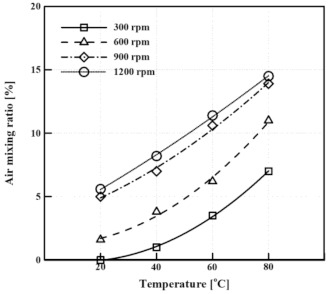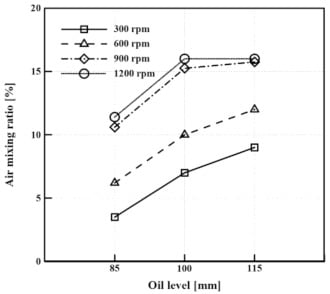 It is significant to understand the change in the properties of the mixture rather than the flow of oil at the lower part of the coil. Figure 12 shows the mixing ratio of oil and air according to oil level and rotational speed. When the oil level was 85 mm and the rotational speed was 300 rpm, the air mixing ratio was the lowest at 3.5%, and the thermal conductivity was 0.134 W/m∙K. When the oil level was 100 mm, the air mixing ratio was 7%, which is 3.5% higher than when the oil level was 85 mm. When the oil level was 115 mm, the air mixing ratio was 9%, and the thermal conductivity was 0.111 W/m∙K, 17% lower than that when the oil level was at 85 mm. The air mixing ratio at 600 rpm was 3% higher than that at 300 rpm but showed a similar trend. When the oil level was 85 mm at 900 rpm, the air mixing ratio was the lowest at 10.6%. When the oil level was 100 mm at 900 rpm, the air mixing ratio was 15.3%, which is 4.7% higher than that when the oil level was 85 mm. When the oil level was 115 mm, the air mixing ratio was 16%. The air mixing ratio at 900 rpm and 1200 rpm demonstrated similar trends.