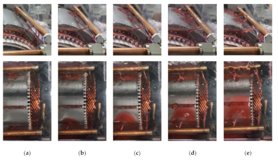 In the next section, the oil behavior, which has a large influence on a motor’s thermal management, is analyzed through flow visualization experiments. In particular, by intensively analyzing the oil flow field and the thermal conductivity of the mixture, we can analyze the oil behavior inside the motor that affects heat transfer. Since the upper part of the coil is cooled by the sprayed oil, we analyze the oil film formation rate. The oil flow on the outer surface of the coil is also analyzed. Next, for the lower part of the coil, because it is cooled by being immersed in oil, we analyze the air mixing ratio of the oil. The thermal conductivity of the mixture is calculated and compared based on the air mixing ratio.