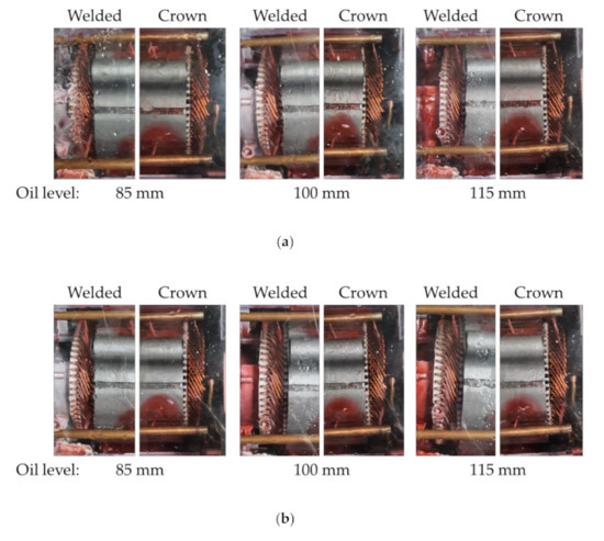 Since there is no oil flow in the lower part of the coil, it is important to understand the changes in the mixture’s properties. However, as the oil level increases, the flow field cannot be ignored. Figure 13 shows the pictures of the welded and crown parts of the coil at 60 °C and 0.084 kg/s. Figure 13a shows the results for each oil level at 900 rpm. In the crown part, the oil film formation by oil level was similar. This is because the oil level does not affect the formation of the oil film at the top of the coil, and the temperature and flow rate of the oil have a significant influence on the formation of the oil film. In the welded part, when the oil level was 115 mm, the oil was churned by the rotor and went over the shaft. As the oil churned, it mixed more with the air, which lowered the thermal conductivity. Figure 13b shows the results for each oil level at 1200 rpm. Even if the rotational speed increased, the oil film formation was similar for each oil level. This indicates that not only the oil level but also the rotational speed do not affect the formation of the oil film at the top of the coil. At 1200 rpm, the churning of the oil at the oil level of 100 mm can be observed. When the oil level was 100 mm, churning occurred at 1200 rpm, and when the oil level was 115 mm, churning occurred at 900 rpm. Therefore, the oil level has a significant influence on the air mixing ratio and causes churning due to the rotor’s rotation.