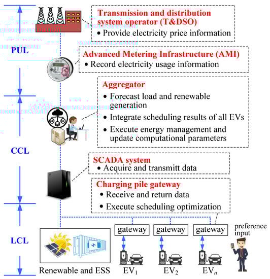 The scheduling scheme proposed for EV charging stations can be mainly divided into three levels, namely power utility level (PUL), central control level (CCL), and local control level (LCL) (Figure 1). The functions and operational contents of the three levels are as follows.