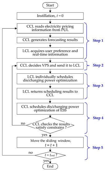 Step 4: The aggregator is used to schedule the charging and discharging power of ESSs according to the scheduling results obtained from all LCL units. Subsequently, determine whether total power consumption violates the power security constrains. If yes, go back to Step 2 to adjust the VPS. Otherwise, the scheduling process ends.