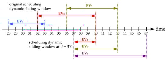 Similarly, the original scheduling dynamic windows of EV2 and EV3 were set as (32, 40) and (36,43), respectively, according to Figure 3. When t = 37, the scheduling dynamic windows of EV2 and EV3 become as t2 = (37,40) and t3 = (37,43), respectively. At this moment, EV1 is not considered because left before. In addition, since EV4 arrives at t = 37, its scheduling dynamic window is set as (37,47) according to the expected departure time given by the driver.