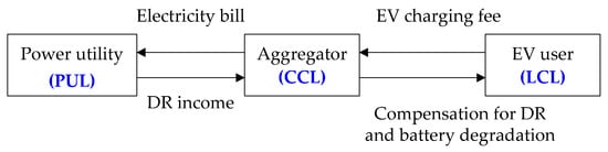 Figure 4 illustrates the relationship between the revenue and cost of the proposed scheme for EV charging stations. The aggregator was used to pay the electricity bill to power utility. If the aggregator participated in the DR market, it may obtain income from power utility. In addition, EV drivers should pay for charging piles. By contrast, if some drivers are willing to provide their EV batteries to the aggregator for participating in the related energy market as mentioned in [3,4,5,6]. the aggregator should share the profit with these EV drivers. Although payment from EV drivers to the aggregator may decrease because of the compensation from the aggregator, the additional cost of EV battery degradation may be caused by frequent charging and discharging operations. In the proposed method, the battery degradation cost was estimated and should be compensated using the aggregator.