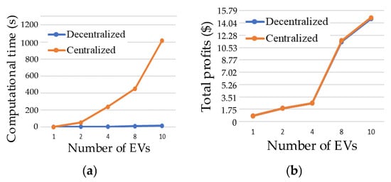 This section and Figure 8 present the comparison between decentralized and centralized methods. With different EV numbers, the computational time, optimized performance, and total profits varied accordingly. Although the total profit of the centralized method was slightly higher than that of the decentralized method, the computational time was considerably longer because of its higher dimension. In practical applications, the real-time computing ability of scheduling is vital to address the stochastic feature of users. Thus, in this study, the decentralized method was employed to solve the scheduling problem of EV charging stations.
