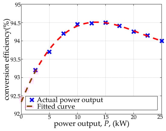 Similar to the other power converters and inverters, because the conversion efficiency of EV charging piles changes with varying load conditions, a fact which influenced the scheduling results. To the best of author’s knowledge, no study has investigated the effect of the conversion efficiency of EV charging piles on EV charging/discharging scheduling. Figure 9 presents an example of a characteristic curve [4] of conversion efficiency η(P) and load conditions P of a 25-kW DC-charging pile, where the blue crosses and red dotted line are the measured data and their fitted curve, respectively, which can be expressed as (26).