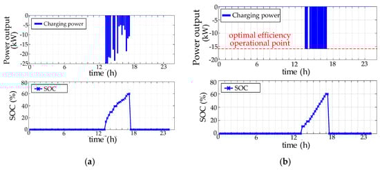 Consider the 80th EV charging pile as an example. Figure 10 illustrates its charging power profile and corresponding SOC curve variations with the conversion efficiency consider or not. The results indicate that the EMS has the EV charged during the periods with lower electricity prices to meet the charging demand of EV. As the conversion efficiency is taken into account as shown in this figure, the EV charging power is set near as close as possible to the high-efficiency operation point, such as 15 kW.