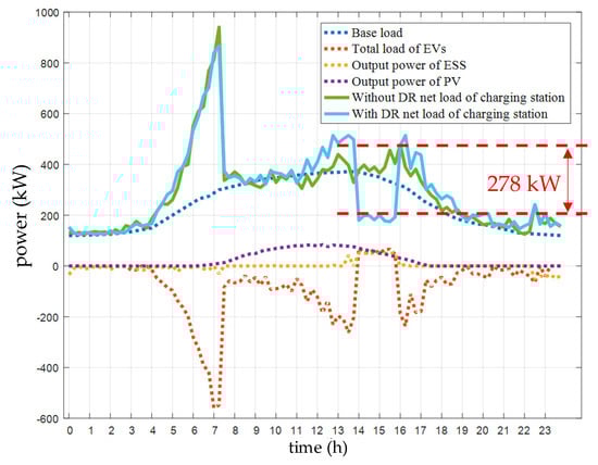 Figure 11 illustrates the load profiles of the EV charging station with a DR compensation price of 0.34 USD/kWh. Through the DR program, the charging system was used to discharge power during the DR period to shave a peak load. The simulation result indicated that the charging station system may be used to advance or delay the charging time for discharging power during the DR period and simultaneously satisfy user demands.