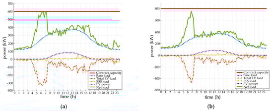 Daily power profiles with contract capacities of (a) 600 and (b) 800 kW.