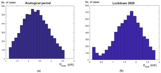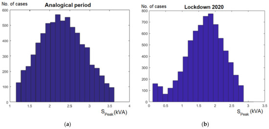 Histograms of apparent power peaks registered in users during (a) 2018 and (b) the lockdown in 2020.