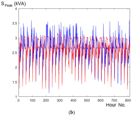 To determine the maximum loads, the apparent power values of individual residential users from both sets were determined at 1-h intervals, taking into account the larger of the inductive and capacitive reactive power loads that were recorded at the same 1-h interval. In this way, information was obtained on the potentially possible maximum load, taking into account the variant of the highest reactive power demand, increasing the current load of the feeders. The calculation of these values was carried out as follows: