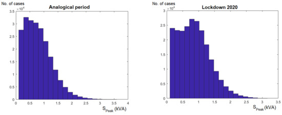 For each residential user, the highest value of active and apparent power that occurred in the analysed periods (lockdown and before the pandemic), as the peak load of a given customer, was determined. Histograms of the peak values are presented in Figure 2 and Figure 3.