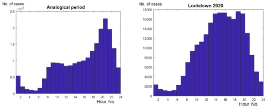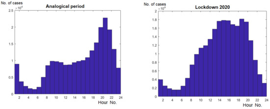 Figure 5, Figure 6, Figure 7 and Figure 8 show statistics on the load peaks recorded each day of the analysed national quarantine period and the analogous period in 2018. The distribution of load peaks during the lockdown is more even but still right-handed. The time of possible peak loads has also been extended during the lockdown (2–9 p.m.).