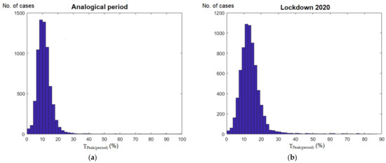 Histograms of peak power duration, TPeak(period) values, over 815 h covering the same period as the lockdown of 2018 (a) and the 2020 lockdown (b), in percentages.