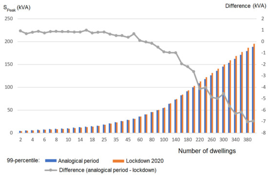 Comparison of the apparent power peaks (designated as the 99 percentiles from bootstrap tests) in the node feeding the respective number of residential users—horizontal axis, pre-pandemic (2018); and lockdown—vertical axis on the left; the absolute difference between the pre-pandemic and lockdown 2020—vertical axis on the right; values in kVA.