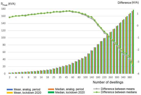 The differences in values representing possible peaks as a function of the number of users (dwellings) between the lockdown 2020 and the pre-pandemic period are not large—of the order of a single kVA, which, with peak loads in nodes above 50 kVA, gives differences of only a few percent. It can be noted that, during the lockdown, there is a relatively small increase in peak capacity at the node with only a larger number of users (above 60: for the 99-percentiles from bootstrap tests and above 180 for the averages and medians from these tests) in relation to the pre-pandemic values. This may result from the flattening of the daily profiles of individual residential users during a lockdown—peaks flattened during similar periods of the day do not pass but overlap, and the greater the number of residential users, the greater the probability of overlap of values close to the peaks.