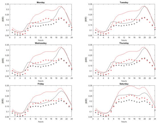 Averaged profiles of the daily active power load of residential users on particular days of the week (averaged over 1-h intervals), based on the averaging of the set of dwellings, including the lockdown period in 2020 and the corresponding period of 2018: continuous lines present usage profiles, and points refer to standard deviations of values at a given hour of the day.