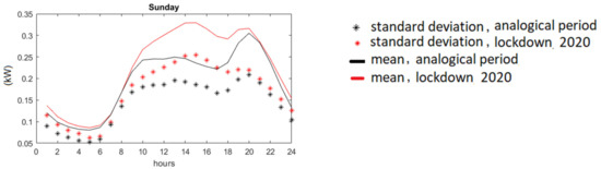 By averaging the measurement values for all days of the week, with equal weight for each dwelling, the shapes of the average daily profiles of active energy use by a residential user during the lockdown in 2020 and the same period before the pandemic were obtained. Figure 12 present the obtained daily profiles of active power (in 1-h intervals) of residential users together with the values of standard deviations in both analysed periods. Flattening of the daily profiles is noticeable during the lockdown for working days, with a practically unchanged peak power. Standard deviations increase during the lockdown, practically only for the daytime hours.