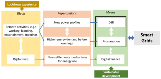 This article analyses energy use in a specific group of users, i.e. households, on the example of dwellings in a large Central European city (Warsaw, Poland), comparing the values obtained from measurements during the lockdown period (called in Poland “national quarantine”, i.e., mobility or activity limitations in the whole community) and the corresponding period of the year before the pandemic. The discussion was additionally extended to naturally arising interest in new forms of participation of household users in the Smart Grid, which is fostered by the improving digital competences of the inhabitants, enforced by the activities during the lockdown. This work, therefore, has two methodological layers—the first based on real case studies, and the second of narration and considerations based on the literature.