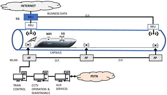 The design of the communications networks necessary for the operation of the Hyperloop capsules is similar to that of modern high-speed and metropolitan railways that operate in an automated way [12,13]. The wireless communication systems of HSR, intercity railway, subway, light rail, and other rail traffic are deployed with various wireless standards [5,14]. To ensure safe and reliable operation of railways, these wireless standards have to be reliable and robust. In addition, due to the ultra-high operation speed, extremely low end-to-end delay and handover delay are required for operational services transmission, such as train location information. Typically, advanced HST and metros use two separate networks, one for critical communications that are used to control trains and a second network that is used for operating aid and passengers [15]. All of these communications are T2I (Train to Infrastructure), T2P (Train to Passengers), although in the last few years, some metros have implemented T2T (Train to Train) communications to perform train convoys [16].