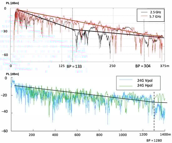 In Figure 4, we can see an example of measurements at two different frequencies on subway round tunnel of 4 m diameter at 2.5/5.7 and 24 GHz [28], and, in Table 5, we have the results of BP and path loss for different frequencies. In this case, the tunnel walls are made of concrete with a dielectric constant of = 5 and low conductivity (). We can see that BP distance becomes larger as frequencies increase and path losses decrease also with frequency. Thus, the use of high frequencies is better for propagation in confined environments like tunnels.
