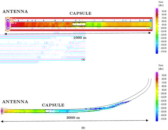 In metal vacuum tubes, we expect even lower losses due to the permittivity and conductivity of the walls. In Figure 5, we can see two simulation made with a propagation simulator [29] for a steel tube of 4 m diameter, straight 1000 m length with a capsule in the middle and curved 3000 m. The frequency of the site antenna 2.5 GHz with a transmit power of 0 dBm and the parameters of the simulation are given in Table 5. In this case, we can see that the losses from the BP (133 m) to the capsule (500 m) the received power changes from −60 dBm to −75 dBm so that losses are 4 dB/100 m, similar to that in subway tunnels. In addition, 23 dBm power at 2.5 GHz could have a cell.