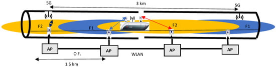 This interval would be 3 s traveling at 1200 km/h. The capsule would be simultaneously connected to two neighboring cells, see Figure 6, using two different frequencies (F1 and F2) in such a way that there would be no loss of data in the event of failure of one of the links and the handover process would be facilitated. MIMO 2 × 2 can be used deploying a set of two antennas in the front and rear of the capsule and the same in the base.