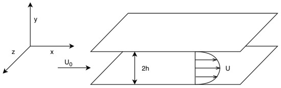 In this work, we are going to simulate a Poiseuille (pressure-driven flow) plane channel flow. Figure 2 contains a schematic description of the channel used for the DNS simulation and the reference system used. The streamwise, wall-normal, and spanwise coordinates are respectively denoted by x, y, and z, and the corresponding velocity components are U, V, and W, or using index notation, for . Statistically averaged quantities are denoted by an overbar, whereas fluctuating quantities are denoted by lowercase letters, i.e., . The governing equations of the system are the incompressible Navier–Stokes equations,
