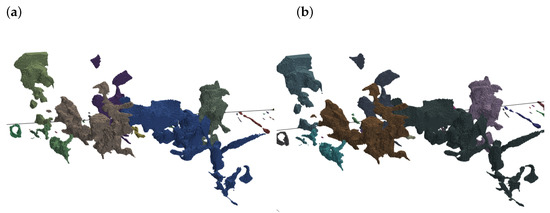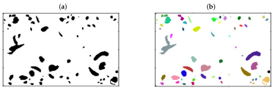Subsequently, the coherent structures can be aggregated from the obtained points into a set of three-dimensional structures in a single time step, classifying them into sweeps and ejections. Figure 3 presents the schematic 2D representation of this step. This figure shows a section of a slice of the domain, where (a) marks, in black, all points fulfilling the criteria and (b) contains all of the structures aggregated, each one filled in a different colour. An efficient method to perform this step has been described in [35]. Finally, in order to reduce the huge number of structures, those with a volume of less of 30 wall units have been removed.
