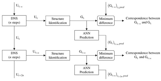 Flowchart of the proposed implementation of the use of Artificial Neural Networks (ANN) in the process of tracking Qs in a DNS simulation. represents the velocity field in step , and the set of features of the Qs of time step . The ANN takes the features of the Qs and predicts the their values in the next timestep, so that they can be compared to the features of the Qs in the next time step.
