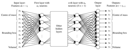 The objective of the neural network is to obtain the values of this set of features on the next time step to the one used as input, so that the structure that is closest to the prediction of all of the ones present in the next time step can be selected to be the continuation of the initial structure. Figure 6 shows the proposed implementation of the use of ANN in the process of tracking Qs in a DNS simulation: the objective of the ANN is to provide an estimation of the geometrical features of the set of Qs for the next evaluated time step. The predictions made can then be compared with the obtained geometrical features of the Qs in the next time step in order to extract the correspondence between the structures in both of the time steps.