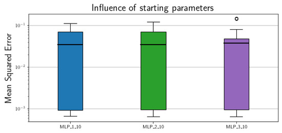 Further sensitivity analysis to initial conditions was performed because of the similarity of the values of the Mean Squared Error for networks MLP_1_10, MLP_2_10 and MLP_3_10_10. Figure 9 contains the result of training these three architectures from 20 different random starting points. Not only the minimum error values are similar for these three MLPs, but their response to different initial conditions of the parameters do not present enough differences to establish that any of the three analysed architectures performs better.