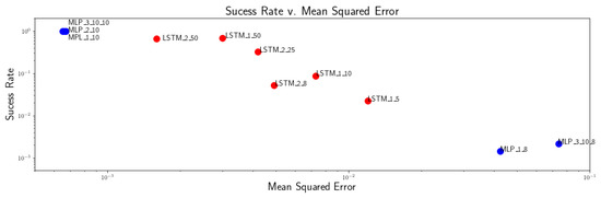 This process was applied to a subset of 2000 sequences from the testing dataset in order to evaluate the overall performance of the different networks. Figure 10 shows the success rate of the predictions of the different networks, as compared to their MSE.