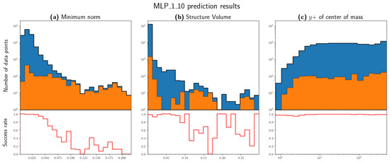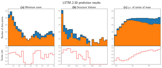 One network of each group was further tested while using the same method in the full testing dataset in order to obtain further insight into the results that were produced by the networks. For the Multi-Layer Perceptrons, the MLP_1_10 was used and this network obtained an overall success rate of 98.74% for all of the predictions done in the testing dataset. For the LSTM networks, the LSTM_2_50 was chosen, obtaining an overall sucess rate of 67.59%. Figure 11 contains the distributions of MLP_1_10’s results of the predictions with respect to Figure 11a the value of norm of the difference between the features vectors of the prediction and the selected structure, Figure 11b structure volume, and Figure 11c distance to the wall of the structure’ centre of mass. Figure 12 contains the same information for LSTM_2_50’s predictions.