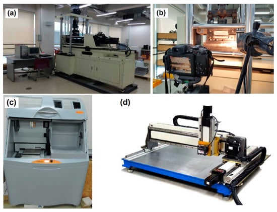 The equipment applied in this study; (a) Servo-controlled direct shear test machine, (b) Camera (Nikon, COOLPIX P600), (c) Zprinter® 450, (d) 3D laser profiler.