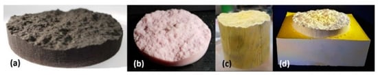 Three different levels of roughness, denoted here as low, medium, and high, were selected to make 27 disc-shaped joint specimens to investigate the shear behavior of disc-shaped rough joints of three sizes under three different normal stress levels. Nine different surfaces for a combination of two factors (joint size, joint roughness) at three levels were required. To make rough plaster joints, nine silicone molds were created using the following procedure. First, a Matlab script was used to generate isotropic artificial rough surfaces with the given parameters (root mean square roughness, fractal dimension, size, and resolution) in the point cloud data format [46]. The code is based on simulating the surface topography/roughness by means of fractals. It uses the Fourier concept (specifically the power spectral density) for surface generation. Afterwards, the point cloud data files were converted to the STL format, and the STL files were then modified and 3D printed. Oil-based paint was uniformly sprayed onto rough surfaces of the 3DP molds for easily release from the final silicone molds (Figure 2a). Finally, to cast the final disc-shaped silicone molds, the 3DP molds were placed in steel molds located on a leveling table. A 10 mm layer of a durable silicone with relatively high viscosity was poured onto the rough surface of the 3DP molds, and a thinner layer (5 mm) of low viscosity silicone was poured onto the cured first layer to make a smooth and flat bottom (Figure 2b). Each plaster cylinder with a rough surface made by applying the silicone and steel molds (Figure 2c) was then encapsulated in the same casting material with a higher gypsum powder to water ratio (3.55:1) to be secured in each half of the specimen holder (Figure 2d).