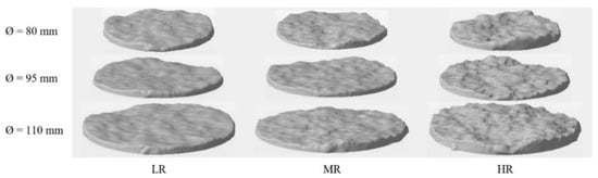 All of the plaster disc-shaped joints were cast using these nine silicone molds. However, the roughness of the generated surface in Matlab gradually degraded during the molding process. As the final goal was to create three plaster joints of various sizes (three sizes) with the same roughness, continuous attempts to generate rough surfaces (by Matlab) were made until the final goal was reached. The roughness value of each joint was measured considering several sampling profiles parallel to the shear direction. The distance between two adjacent sampling profiles was set to be 0.5 mm. As the applied roughness parameter (Z2) is sensitive to the sampling interval [47], the same sampling interval of 0.5 mm was considered along each sampling profile. The number of points sampled for 80, 95, and 110 mm joints were 7338, 10,336, and 13,882, respectively. Z2 values of the sampling profiles were measured for each joint, and the average value was eventually considered as the representative roughness value for the joint. Table 3 lists the measured Z2 values of the generated, 3DP, and final plaster joint surfaces for all nine cases. The converted JRC values in the table were calculated using the equation proposed by Tse and Cruden () [44]. Figure 3 illustrates the surfaces of the final plaster joints scanned by a 3D laser profiler.