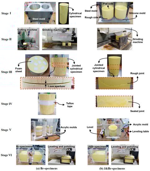 Twenty-seven rectangular cuboid plaster specimens (length: 150 mm, width: 115 mm, height: 130 mm) embedding a single non-persistent rough joint were cast to investigate the simultaneous shear behavior of joint and rock bridge. The specimen preparation process of J&Br specimens is quite similar to that applied for the Br specimens and consists of the following stages (Figure 4b).