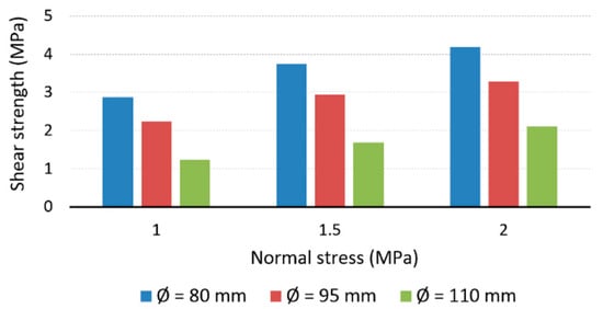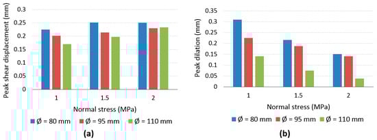 In case I experiments, the applied normal load () is entirely distributed over the bridged zone of the weakness plane (). Therefore, the normal stress applied onto the bridged zone is higher than the nominal normal stress (), and the shear strength of the specimen is solely dominated by the shear resistance of the rock bridge. Several Br specimens containing a single joint of three different sizes (Ø = 80 mm, Ø = 95 mm, and Ø = 110 mm) were prepared and subjected to direct shear tests under three different normal stress levels (1, 1.5, and 2 MPa). As the joints are open, the shear test results reflect only the resistance of the bridged zone of the weakness planes. Figure 5 shows the shear tests results. As expected, the shear strength is higher for the cases with greater rock bridge ratios subjected to higher normal stresses. The values of the peak shear displacement and peak dilation for the tested samples are illustrated in Figure 6a,b, respectively. As shown, the specimens with greater rock bridge ratios subjected to higher normal stresses were sheared for longer distances before failure, and those with greater rock bridge ratios subjected to lower normal stresses experienced more dilation at the failure moment.