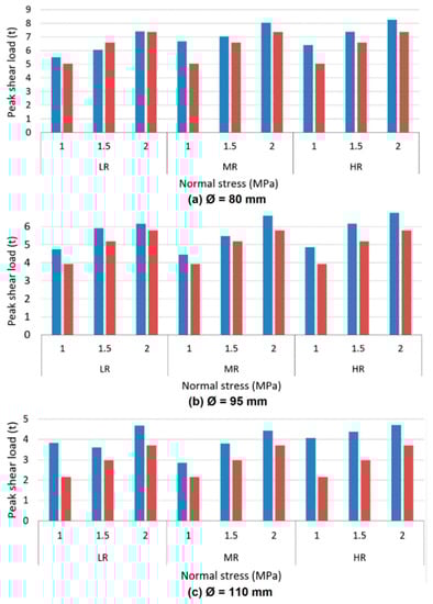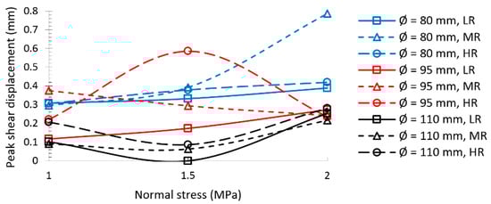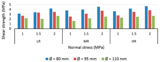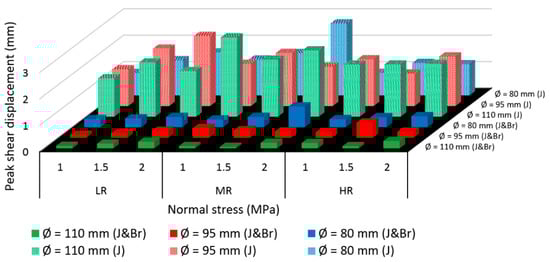 In this section, the experimental results of direct shear tests carried out on J&Br specimens are provided. These results reflect a complicated mechanism when a weakness plane is under direct shear test condition with the shear resistance depending on the simultaneous mobilization of joint friction and intact rock cohesion. Figure 7 shows the shear strength of the J&Br specimens with a single embedded joint of three different sizes (Ø = 80 mm, Ø = 95 mm, and Ø = 110 mm) and three different roughness levels (LR, MR, and HR) when subjected to three normal stress levels (1, 1.5, 2 MPa). As shown in the figure, the normal stress and rock bridge ratio have strong effects on the shear strength of the J&Br specimens. The shear strength of the specimens increases by when the rock bridge ratio and applied normal stress increase. Although the overall trend shows a direct relationship between the joint roughness and the shear strength of J&Br specimens, the effect of the joint roughness on the shear strength is less than that of rock bridge ratio or normal stress. Figure 8 and Figure 9 depict the peak shear displacement and peak dilation of the J&Br specimens, respectively. The overall results show that the specimens with greater rock bridge ratios experienced greater peak shear displacement when undergoing greater normal stresses (Figure 8). Figure 9 indicates that J&Br specimens with greater rock bridge ratios experienced greater peak dilation when undergoing lower normal stresses.