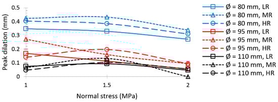 Peak dilation of J&Br specimens embedding a single joint with different sizes and roughness under different normal stress levels.