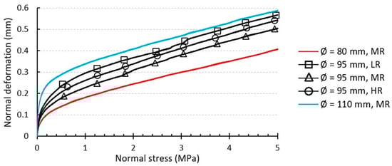 Normal stress-normal deformation curves of J&Br specimens subjected to uniaxial compressive loading.