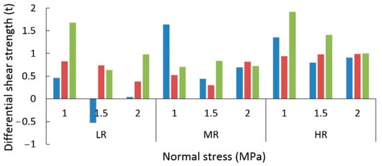 The actual shear mechanism of the specimens with a non-persistent rough joint and the true physical interaction between the bridged and jointed zones of the weakness plane during shearing process occur for the case II experiments. Hence, the shear strength of the specimens obtained from the experiments of case I was compared to those obtained from the case II experiments. Figure 11a–c show the shear strengths obtained from case I and case II experiments when the joint diameters are 80 mm, 95 mm, and 110 mm, respectively. The comparison clearly shows that the maximum shear load required to break J&Br specimens is underestimated when the friction contribution of the jointed zone is ignored. The difference between the shear strength obtained from case I and case II experiments (subtracting the values of the red bars from those of the blue bars in Figure 11) is illustrated in Figure 12. As shown in most of the cases, the greater differential shear strength is for the specimens with wider joints. This shows that the involvement of the embedded joint in the shear strength is more pronounced when a wider portion of the plane of weakness is discontinuous. The normal stress and the joint roughness do not appear to have any constant influence on the differential shear strength. Overall, the results of experiments show that the portion of applied normal load distributed to the jointed zone of weakness plane is not negligible and therefore joint friction contribution should be considered when evaluating the shear strength of the planes.