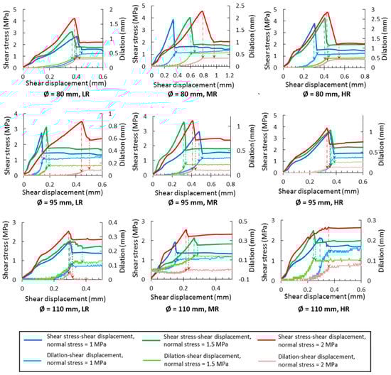Figure 14 shows the shear stress/dilation-shear displacement curves of the J&Br specimens subjected to the direct shear test condition. As shown in the figure, the dilation curves consist of three phases. The first represents the dilation of the specimens before the moment of failure. This phase begins with the initiation of the test and ends at the point corresponding to the peak shear stress, denoted by the dash-dotted line arrows in Figure 14. In the first phase, all of the J&Br specimens experienced a certain amount of dilation, mostly controlled by the normal load applied to them. The shear stress drops sharply at the moment of failure and reaches a certain point (toe). The second phase of dilation starts at the point corresponding to the peak shear stress and ceases at the point corresponding to the toe, denoted by the dashed line arrows. In this phase, the specimens dilate due to crack propagation and coalescence. This dilation is followed by compression for some specimens (e.g., Ø = 95 mm, MR, 2 MPa) because the cracks are closed after coalescence. The third phase starts immediately after the second phase and expresses the dilation behavior of the failure planes created after the specimens were broken into two halves in the second phase. The experimental results show that the specimens subjected to higher normal stresses underwent less amount of dilation, and those with rougher and smaller joints experienced a greater amount of dilation during the last phase of dilation.