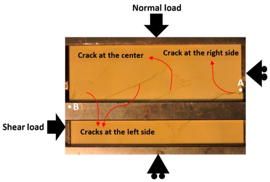 In most previous experimental and numerical studies of the failure mechanisms of specimens containing edge-notched non-persistent (open) joints under direct shear test condition, the tensile mode was more frequently reported as the cause of the initiation and propagation of cracks inside a rock bridge [5,30,31,35,39]. All of the J&Br specimens were monitored using a camcorder while they were subjected to the direct shear test condition, and the cracking process was studied extensively. Figure 16 indicates that the shear load is applied to the lower part of the specimens from the left side and that the normal load is exerted downward over them. The vertical movement of lower shear box is restricted and the upper shear box is only allowed to move vertically. As shown in the figure, cracks initiate and propagate from three different zones: the left side, the center, and the right side of the specimens.