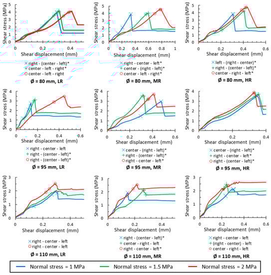 Figure 17 shows the initiation moment and the sequence of cracks on the shear stress–shear displacement curves (by the ×, +, and ᴏ symbols) leading to the failure of J&Br specimens subjected to the direct shear test condition. The sequence of initiation of cracks is indicated in the legends of the graphs in Figure 17. The locations of cracks which initiated at the same time are indicated in parentheses, and the star symbol beside a cracking zone indicates that the crack initiated and propagated explosively through the zone. As shown, the first crack initiated in the vicinity of point A (the axis of rotation) and propagated toward the circumference of the embedded joint and then to the lower part of the specimen. For the cases with smaller joints (Ø = 80 mm), the first cracks most commonly initiated at the center of the specimens. The first cracks most commonly initiated before the failure of the specimens and did not have any significant impact on the path of the shear stress–shear displacement curves. The cracks which initiated at the central zone did not affect the curves. Finally, the last crack, connecting the left side of the joint circumference to point B, eventually results in a rupture with the embedded joint and the right-side crack. The final cracks always coincide with the peak shear stress and dramatically reduce the shear resistance of the specimens. The J&Br specimens with greater rock bridge ratios (Ø = 80 mm and Ø = 95 mm) mostly experienced an explosive and violent rupture. However, the final cracks propagated smoothly through the specimens containing a wider joint (Ø = 110 mm). The normal stress and joint roughness have no clear effects on the crack initiation moment and the sequence of the cracks.