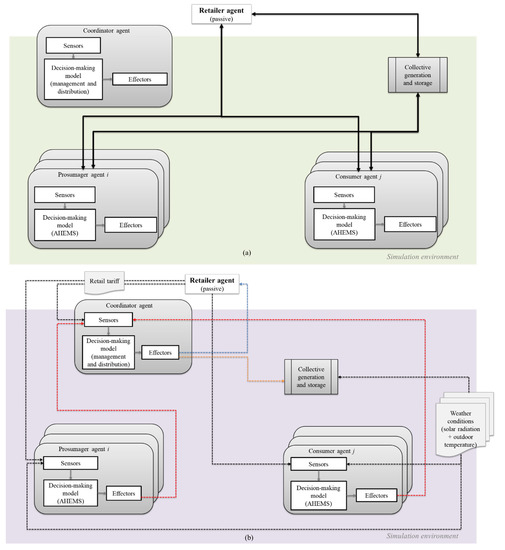 The growing penetration of renewables has created new challenges in the operation and management of power systems, also considering the pervasiveness of information and communication technologies (ICT), real-time monitoring and control devices, advanced metering infrastructures, etc. This digitalization trend is expected to generate massive amounts of data which require sophisticated data handling techniques [26]. Also, from a modeling point of view, new challenges are created due to the increasing number of actors and the dynamics of their interactions in decentralized energy systems, as LEC, marked by a noticeable socio-technical dimension [27]. In this setting, Artificial Intelligence (AI) has been identified as key to deal with modeling and decision support [26,28]. Distributed Artificial Intelligence (DAI) is a subfield of AI which is based on the interactions of intelligent agents capable of making decisions to achieve goals while co-habiting in an environment populated by other agents [29]. Based on a new programming paradigm for software engineering called Agent-Oriented Programming (AOP), multiagent systems (MAS) are a relatively new field of DAI [30]. In MAS, autonomous agents are endowed with the ability to adjust their behavior, communicate, negotiate, and collaborate, cooperate or compete to achieve their goals [31,32]. Agents take sensory input from the surrounding environment and from other agents while performing actions upon the environment (through actuators), to reach their goals. Thus, they must be able to reason and decide how to act in specific circumstances [33]. The rules driving their behavior are implemented in their architecture and consist of a set of modules used to solve subproblems defining the actions agents must perform [34]. Different architectures must be created defining the complexity of the action rules implemented. The most well-known agent architectures are described as follows [34,35,36]: