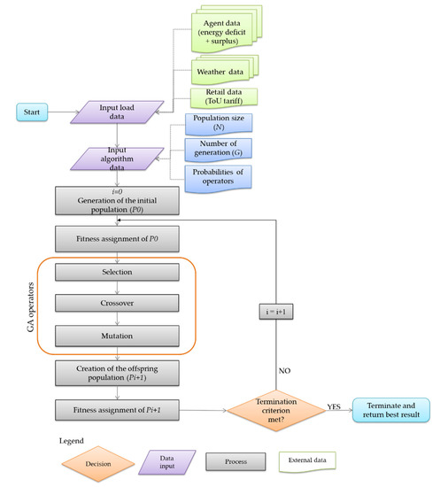 Several energy related issues have been exploited by using MAS, including residential demand-side flexibility [37], electricity market transactions [38], virtual energy trading between microgrids [39,40] and grid stability issues [41]. MAS has also been used to model different strategies of automated energy demand management [37] and to represent energy demand dynamics in residential and non-residential scenarios, as in [42,43,44]. More recently, the MAS framework has been used to solve energy management problems, which are the most relevant problems in LEC ambitioning to reach self-sufficiency. In [45], autonomous agents with their own demand profiles and generation and storage systems must decide how to use locally generated energy, when to charge/discharge batteries, how to manage loads, and even when to trade electricity within the neighborhood to minimize electricity costs. Optimization algorithms, both exact methods, as in [46], and nature-inspired metaheuristic approaches (as genetic algorithms (GA) [47] and evolutionary algorithms [48,49]) can be embedded in MAS to optimize energy resources management [50,51]. For instance, reference [52] proposed a MAS to optimize the energy flows between a LEC of prosumers, revealing a good performance in enhancing community self-consumption and reducing members’ costs. Decision-making was based on the Alternative Direction Method of Multipliers (ADMM) algorithm [52]. The work of [53] presented a MAS framework to coordinate and control the generation and demand in a microgrid of diversified consumers. The Tabu Search algorithm was used to minimize consumer agents’ electricity bills, the power withdrawn from the grid and to maximize power quality.